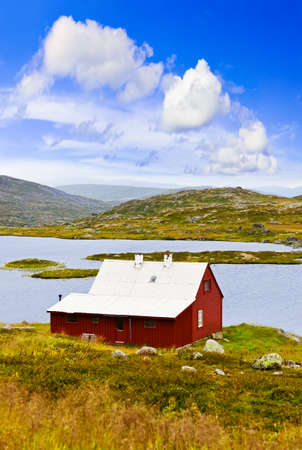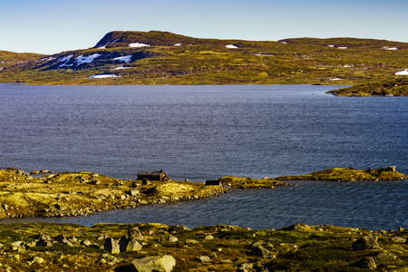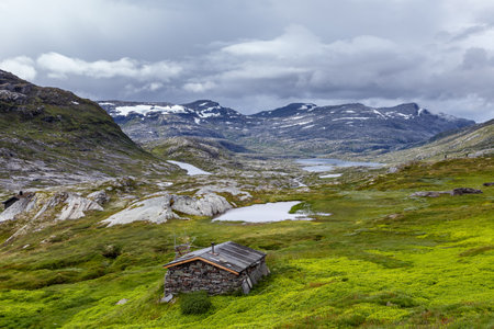 Snowy mountain landscape with small house. National Tourist Route. Rallarvegen, Norway.