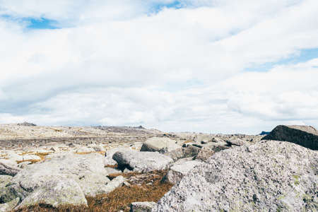Amazing Vavatn lake panorama rough landscape view rocks boulders and mountains during summer in Hemsedal Norway.