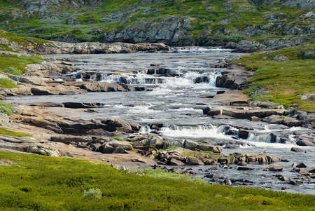 Green summer landscape with river and lake in Hallingskarvet National Park, central Norway. Norwegian County Road 50