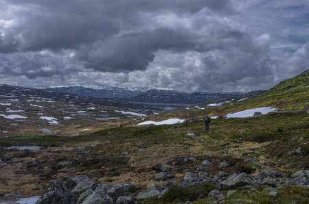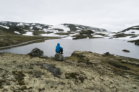 Norway, Lake Flyvotni. Near Sogn og Fjordane County Road. Norwegian Tourist Route Aurlandsfjellet runs from Aurlandsvangen to Laerdalsoyri. Tourist looks at the harsh northern nature