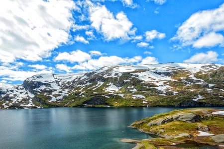 Typical norwegian landscape with snowy mountains and clear lake near the famous Aurlandsvegen (Bjorgavegen), mountain road, Aurland, Norway.
