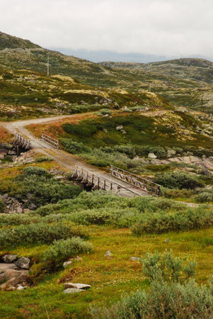A path in the mountains. Hiking trail overlooking hills covered with wildlife and stones. Norwegian landscape. There is a bridge over the stream. Norway, Scandinavia.