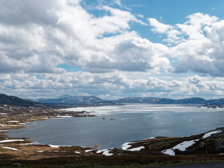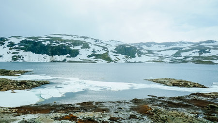 Raw Norwegian Landscape. Mountains Covered by Snow and Lakes. Spring Time.