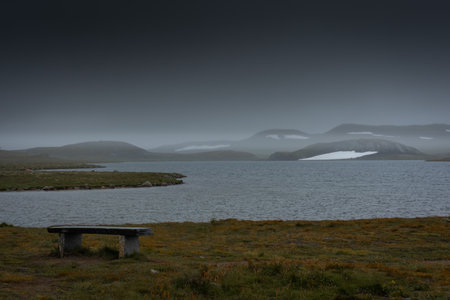Road to scandinavian mountains at breathtaking national park on gloomy autumn day.