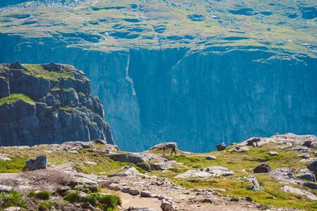 July 26, 2019. Norway tourist route on the trolltunga. People tourists go hiking in the mountains of Norway in fine sunny weather to thetrolltunga. Hiking backpack theme.
