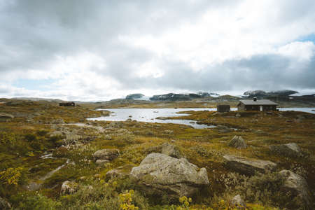 hut wooden mountain huts in mountain pass Norway. Norwegian landscape with typical scandinavian grass roof houses. Mountain village with small houses and wooden cabins with grass on roof in valley.