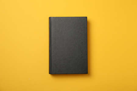 Black book on yellow background, space for text