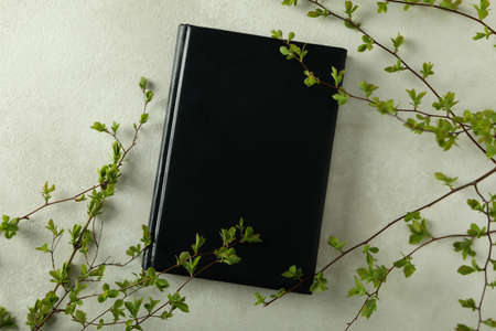 Blank book cover on dark background with blooming clematis flower
