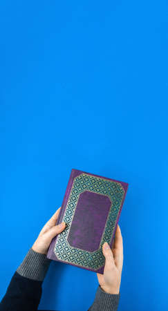 book dark purple color on gray background close-up, top view