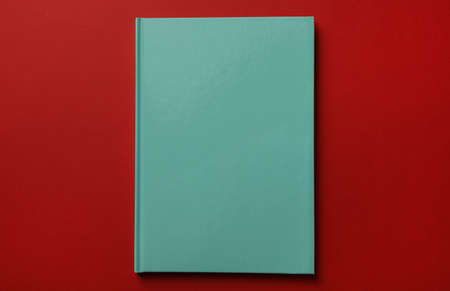 New stylish planner with hard cover on red background, top view