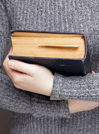 a woman in a gray sweater holds an old book in her hands and hugs her