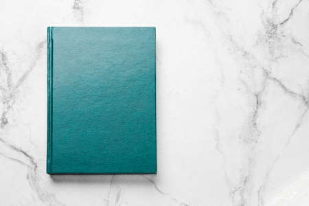book with blue cover, on gray background. top view