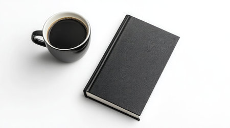 A hardcover book placed beside a cup of coffee on a white background.