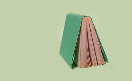 Concept of education, teaching literature, library. Spine end of an open old shabby book, pages fanned out on a background with copy space.
