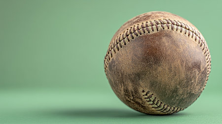 A close-up view of a vintage baseball showcasing its unique texture and intricate stitching against a solid green background, perfect for sports-related themes.