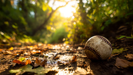 A weathered baseball lies amidst fallen leaves and damp earth, bathed in warm sunset glow within a vibrant, dense forest scene.