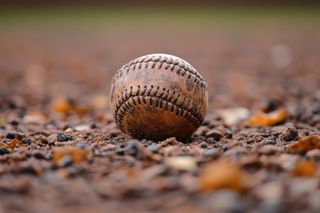 A close-up image showcasing an aged baseball resting on a clay surface, highlighting its texture and shadow, ideal for sports or outdoor themes.