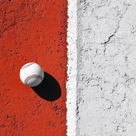 A single baseball rests on a vivid red surface, casting a dramatic shadow that emphasizes its round shape and textured surface, perfect for sports themes.