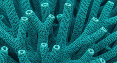 Close up view of a vibrant coral displaying complex organic textures and patterns, highlighting the delicate structures of underwater sea life and its diverse biology
