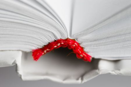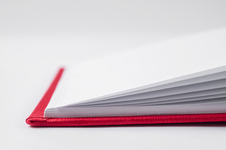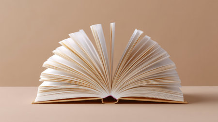 An open book with pages fanned out, resting on a white surface. The book has a red cover and the background is minimalistic, emphasizing the book's structure and the texture of the pages. AI generated image