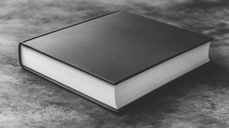 This image features an elegant black book with a leather cover placed on a grey surface, perfect for showcasing modern design and minimalist aesthetics.