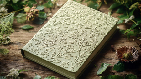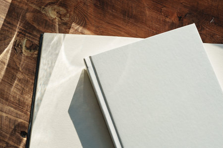 This stylish open book features pristine blank pages, inviting creativity and thought in a tranquil setting with soft, neutral lighting for a calming atmosphere
