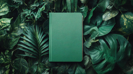 A vibrant green notebook lies on an array of lush tropical leaves, showcasing various shades of green from the surrounding foliage in a serene natural environment.