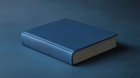 book with blue cover, on gray background. top view