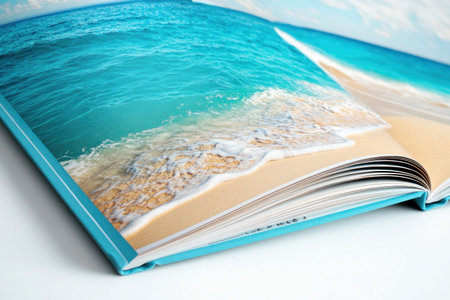 Open book with a tropical beach image and a wave coming out of pages, creating a surreal effect of merging reality and imagination