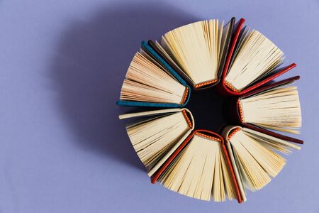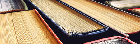 Open book, hardback hard cover colorful books on the table. Back to school. Copy space for text. Education, studying, learning, business concept