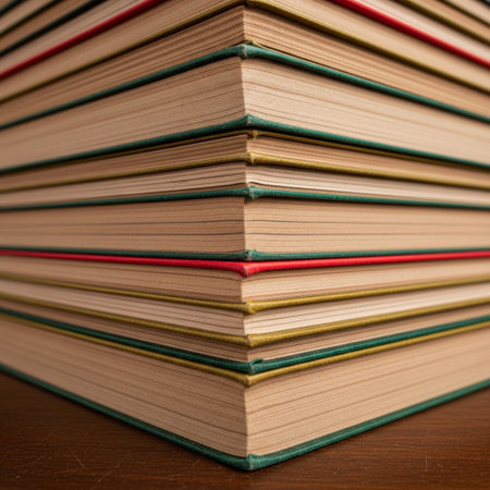 A visually appealing arrangement of stacked books in various colors and sizes against a minimalist white background, perfect for educational or decorative themes.