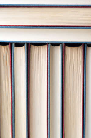 Book spines lined up on the shelf, close-up, learning and education concept.