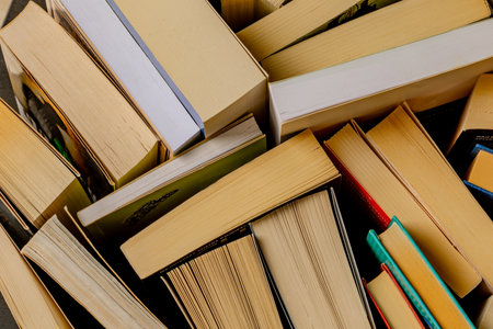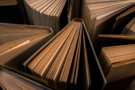 Background From Old Books. Top view of chaotically standing old and used books or hardcover textbooks. Book background template for (wisdom, science and education). The concept of reading and writing