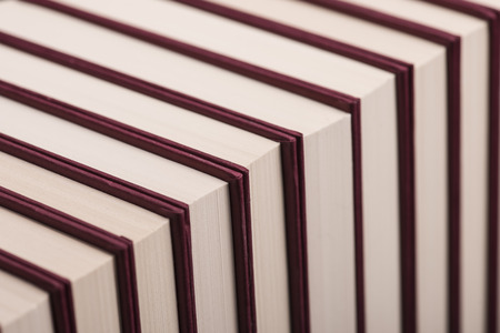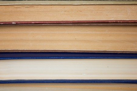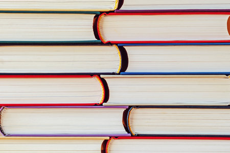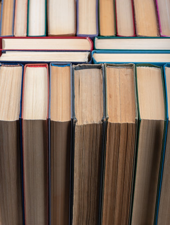 Close-up of book stack. Several colorful books with selective focus. Education concept