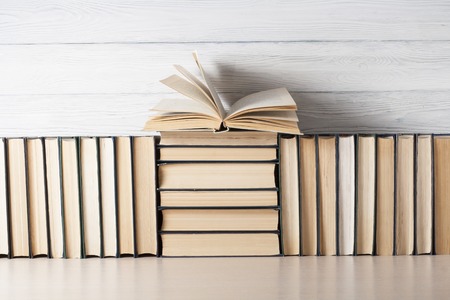A large stack of different books on the surface. With a place for an inscription. The concept of education.