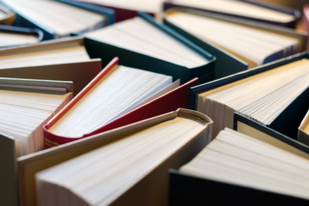 A captivating aerial perspective of numerous hardback books arranged in a circular pattern, radiating outward from an open book at the center, creating a dynamic composition. .