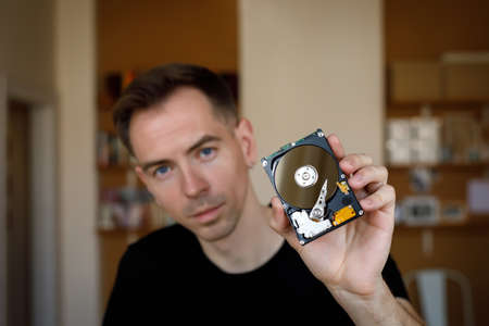 dismantles computer external hard drive. Raises cover of HDD pocket. Concept of repair, data corruption, computer workshop. Close-up.