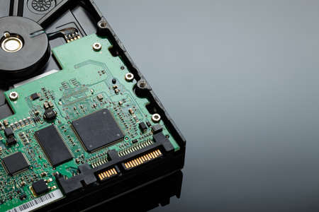 Disassembled computer hard drive. Repair broken computer part, close up of open hard disc drive hdd. Disassembled hard drive from the computer, hdd with mirror effect.