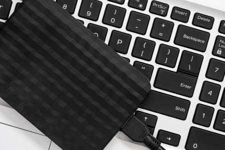 An external or portable hard disk drive (HDD) connected to a laptop for data transfer or backup. Disco Box