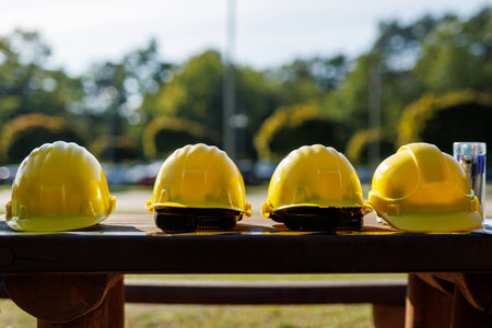 Industrial showing row of construction hard hats lined up outdoors with sunlight and greenery keywords: hard...