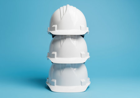Three pristine white safety hard hats stacked vertically, symbolizing safety, engineering, and construction industry standards. clean studio shot on a solid blue backdrop.
