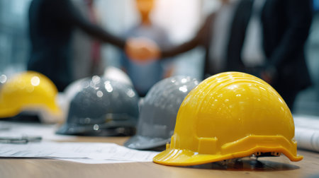 Construction helmets in various colors rest on a table while professionals engage in a handshake, marking the start of a project collaboration.