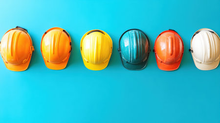 A vibrant collection of safety helmets in various colors lined up against a blue background, symbolizing construction safety and teamwork in the workplace.