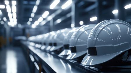 Safety helmets arranged neatly on a wooden bench in an industrial factory setting, highlighting safety protocols.