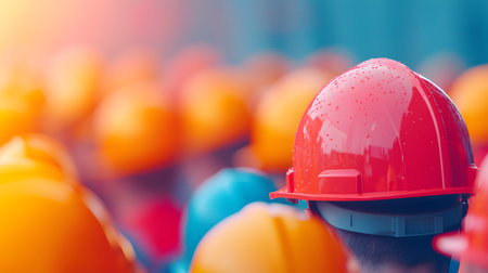 Colorful worker construction hard safety helmets hat for safety projects. 1st May - International labor day concept. Generative ai.