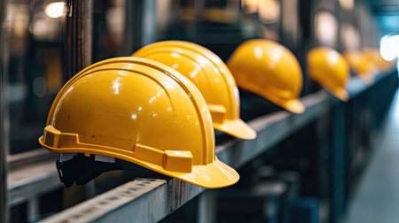 Workers' yellow helmets placed on a metallic surface inside a factory workshop, ready for daily use.