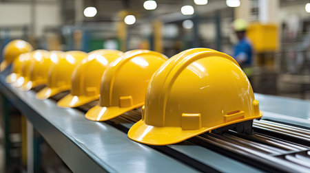 Yellow construction helmets resting on a metal shelf in a busy factory environment with machinery in the background.