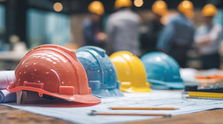 A vibrant shot featuring colorful safety helmets on a construction table among blueprints, highlighting teamwork and safety in a busy construction environment.