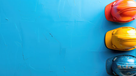 Hard hats in orange and faded white are placed on a blue textured surface, emphasizing the importance of safety gear commonly used at construction sites during work hours.