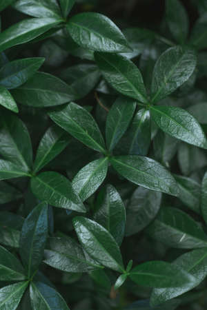 Dark background image of carpet of periwinkle plant leaves. Top view. Flat lay. Copy space. Vertical